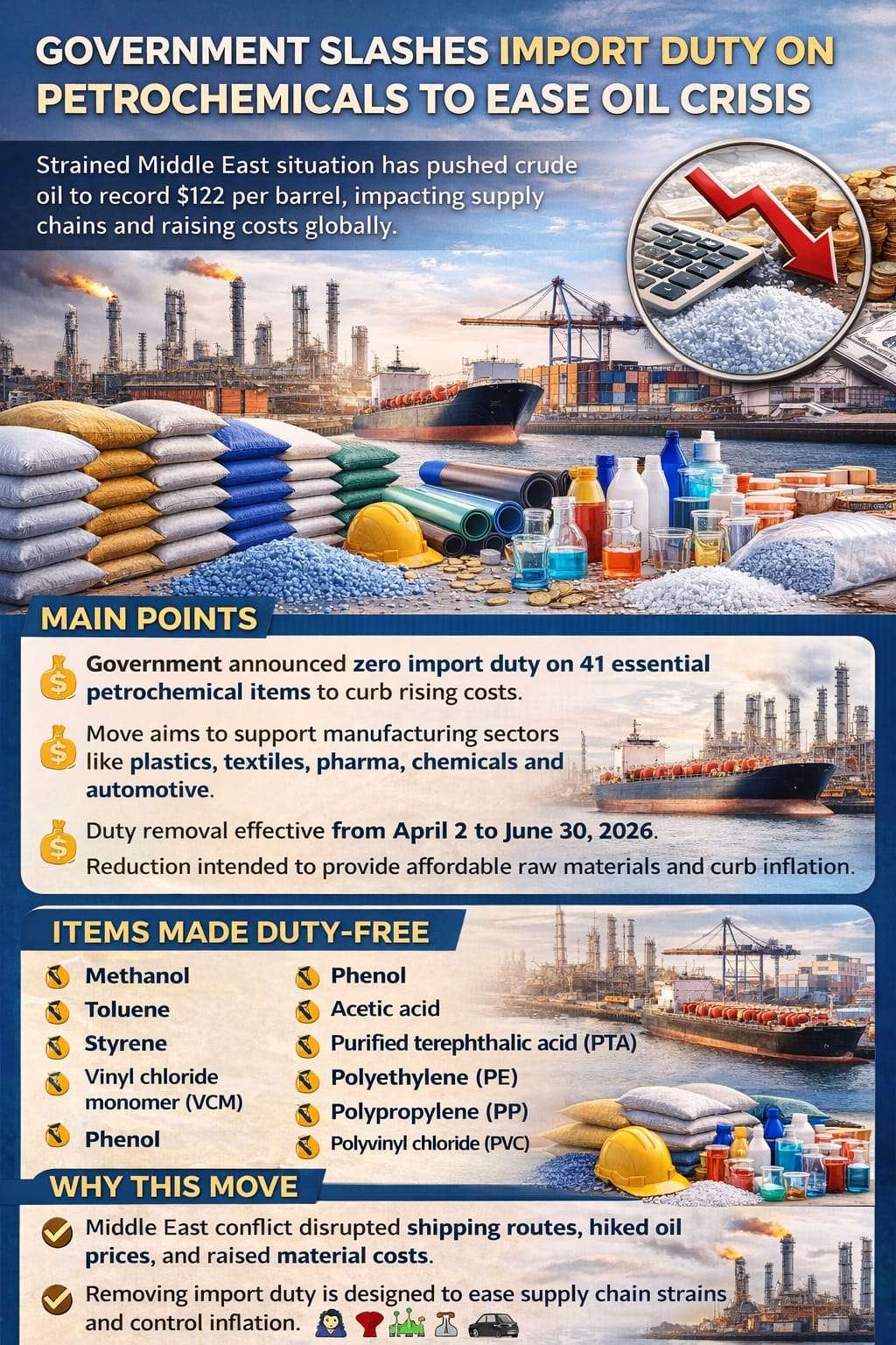 वैश्विक संकट के असर को कम करने की कोशिश, पेट्रोकेमिकल कच्चे माल पर पूरी छूट का ऐलान